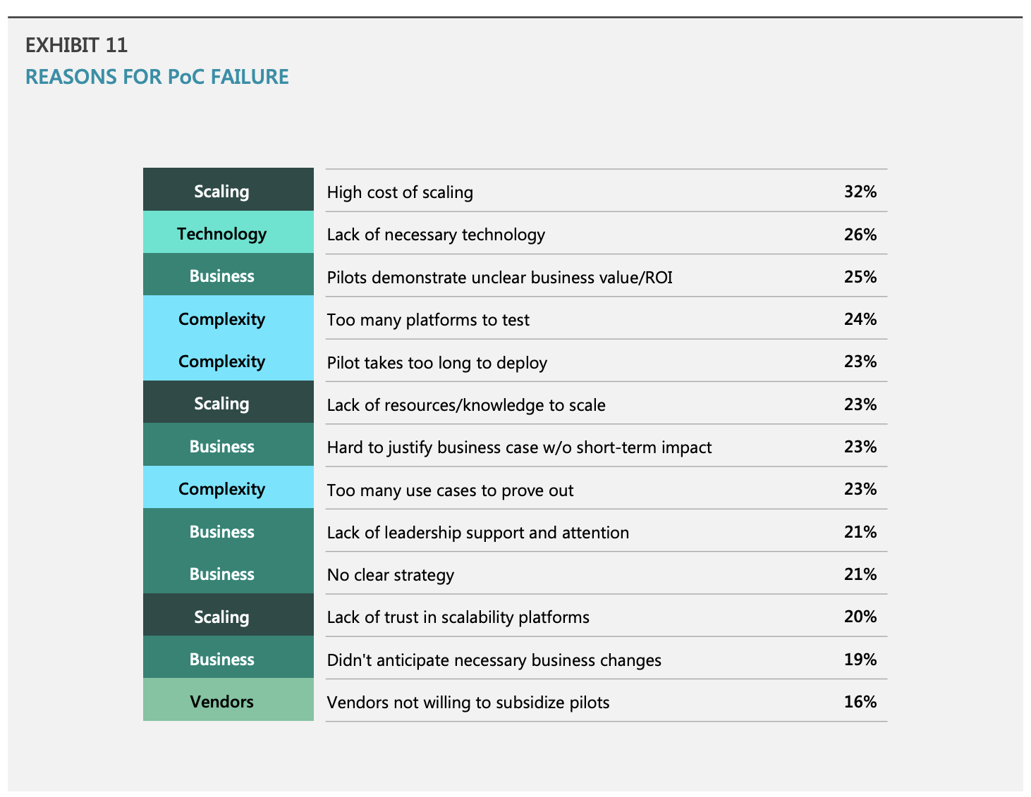 Tuttavia queste tecnologie emergenti possono essere difficile da implementare, a causa di barriere come la complessità di ridimensionamento e mancanza di infrastrutture. Circa la metà dei decisori e gli sviluppatori del campione intervistato affermano che la maggior parte dei progetti sono in fase di prova/PoC. Queste barriere impediscono alle aziende di andando oltre nella loro adozione di queste tecnologie.